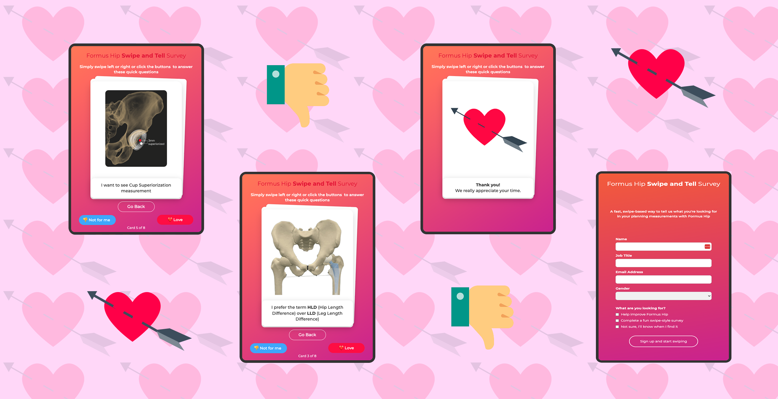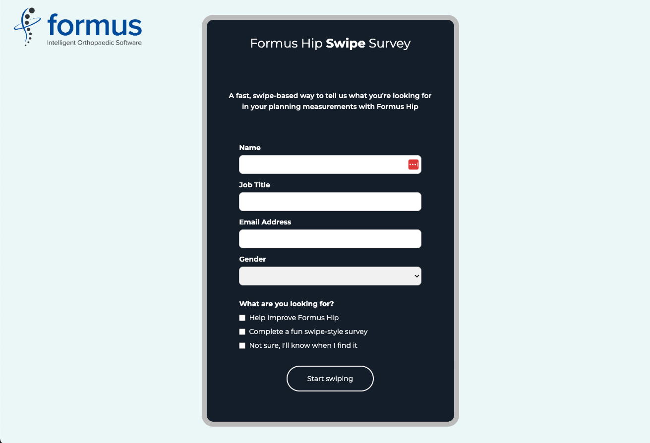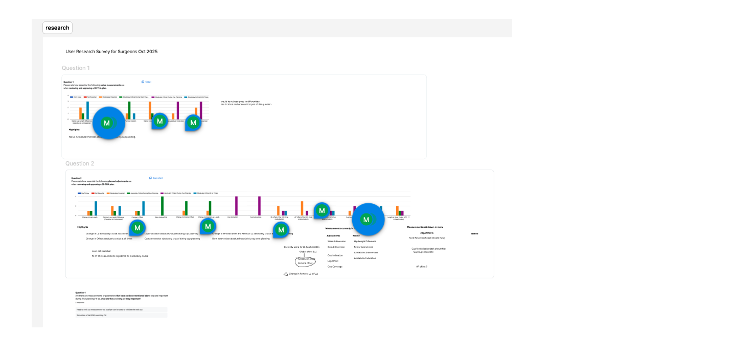 To increase engagement, I designed a Tinder-style swipe survey as a lightweight alternative to our more technical questionnaire, which had only received 4 out of 12 responses. The goal was to quickly validate key data points for key measurements surgeons found most useful. By reframing the experience as quick, visual, and mobile-friendly, I wanted to remove the friction of traditional surveys and appeal to our users who were typically time-poor and bombarded with clinical documentation. It also served as a creative way to test if a more playful format could complement our standard research methods without compromising the seriousness of the subject matter.