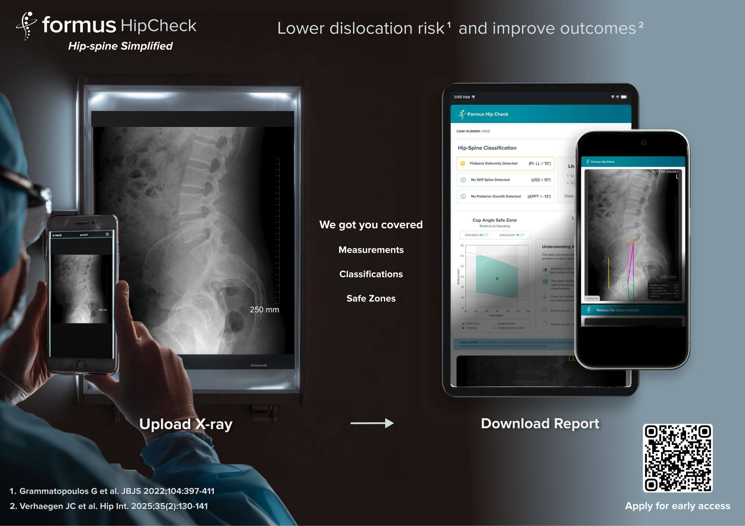 This was a promotional flyer for surgeons demonstrating how they could submit a photograph of their patient x-ray and get a completed screening report highlighting key issues for a patient, including flatback deformity, stiff spine and other key issues. There were all issues that could impact hip dislocation.